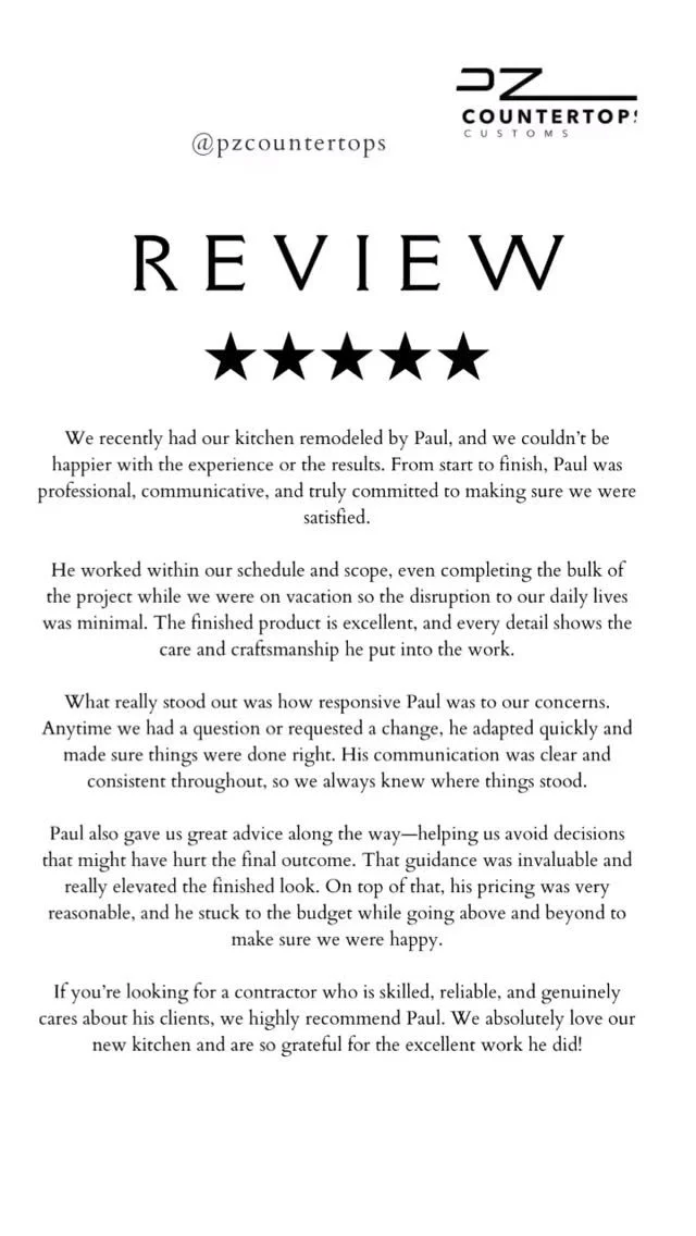 • We had a wonderful experience working with Paul. He is open and honest and you can tell he truly cares for his clients. PZ countertops came highly recommended by a friend and did not disappoint! Paul was extremely easy to reach throughout the entire process answering any questions we had quickly. They have drastically brightened our kitchen and the entire job took less than 3 days! The before and after photos speak for themselves